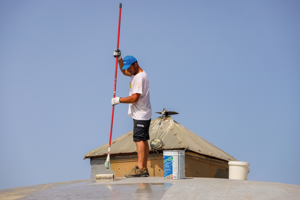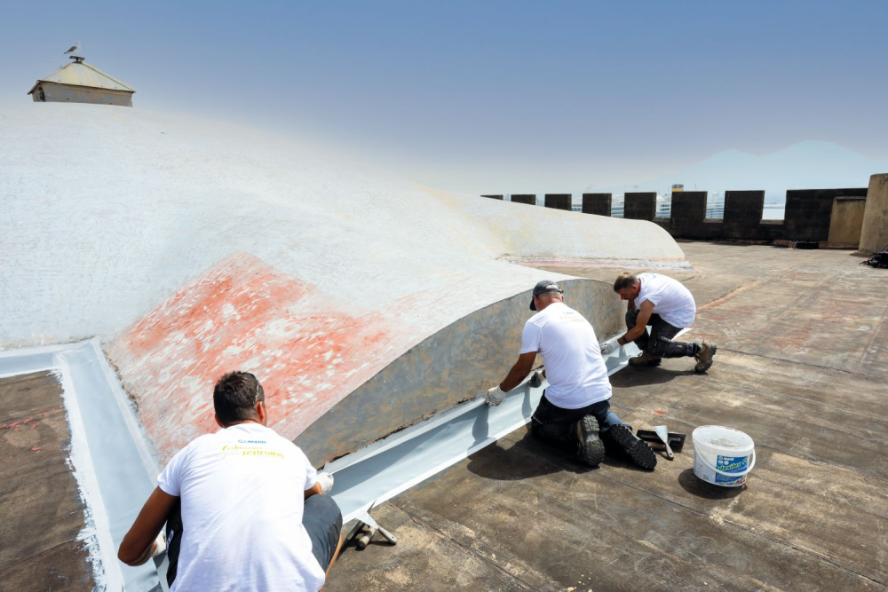 A maradék nedvességtartalmú aljzatok párazárását a Primer PU 60 egykomponensű, nedvességre szilárduló, poliuretángyanta bázisú alapozóval biztosították. A kent vízszigetelésű részekről csiszolással tüntették el a terméknyomokat, majd Mapegrout 430 Zero szálerősítésű tixotróp habarccsal állították helyre a takarást. A kiegyenlítést követően egy réteg Primer SN töltött, kétkomponensű epoxialapozóval impregnálták a felületeket, és Quarzo 0,5 tűziszárított kvarchomokkal szórták meg. A fémszerkezeteket fúrógéphez csatlakoztatott csiszolókoronggal tisztították meg és polírozták fel, hogy aztán egy réteg Mapedeck Primer 200 poliuretán tapadáselősegítővel kenjék le őket.
