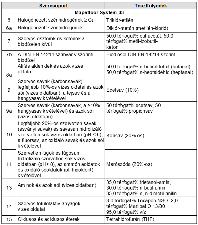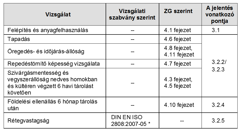 A vizsgálati eljárás az öregítéses eljárás elvén alapul, melynek részét képezi az egyes anyagok tárolása 6-24 hónapos intervallumban az alábbi értékek vizsgálatával, a következő anyagok esetében kiváló megfeleléssel: Primer W-AS, Mapefloor I 360-AS, Primer SN, Mapefloor I 300 SL, Quarzo 0.5, Additix PE, Rézszalag.