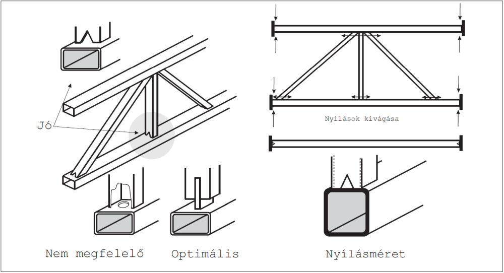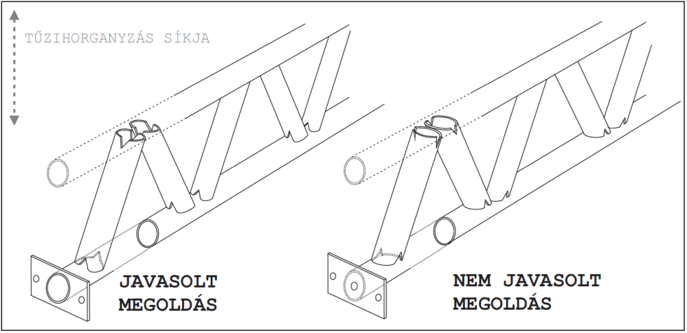 Az 1. ábra bal oldalán lévő tartó esetében mind a rácsrudak, mind pedig az övrúd végén tökéletesen kialakított nyílások, a rácsrúd végein nyílások, sliccelések vannak. A jobb oldali ábrán, a csővégeket lezáró lemez csőközépre fúrt lyukkal, valamint a rácsrudak oldalára elhelyezett kivágások nem megfelelő megoldások, mert folyadékzsebek és légzsákok keletkeznek. Alapelv, hogy a technológiai nyílások szélei mindig érjék el a horganyozás mozgási síkja zárt tér legmagasabb (kilevegőzés) és legmélyebb pontját, vagy legalább azzal érintőleges legyen.