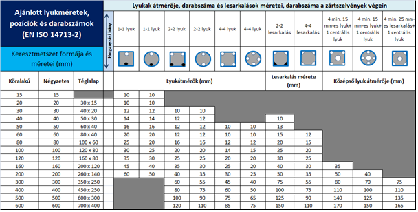 A táblázat tartalmazza az ajánlott technológiai nyílások méreteit és darabszámait.